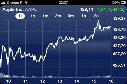 Le prix de l’action chez Apple ne cesse d’augmenter et a battu un nouveau record entre 15 heures et 16 heures aujourd’hui. En effet, la barre des 429$ a été dépassée avec 429,11$ précisément. Ce qui fait monter la capitalisation boursière de la firme à plus de 398,69 milliards de dollars.