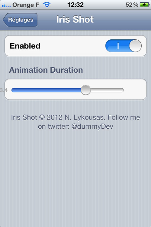 Adepte des screenshots sur votre appareil ? Remplacer le flash d’origine par une nouvelle animation (qui est la même que celle utilisée lors de la prise d’une photo) grâce à un nouveau tweak. En effet, Iris Shot remplacera l’animation de base, ce qui rend tout de même mieux lorsque vous prenez un screenshot. Un simple réglage vous permettra de choisir la durée de celle-ci.