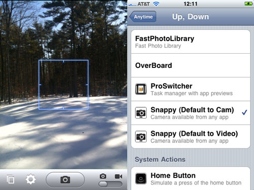 Snappy5 pour rappel vous permet de prendre rapidement des photos en vous donnant la possibilité de prendre rapidement des photos à l’aide d’un geste Activator configurable. Un tweak fort utile puisque Snappy ne lance pas l’application Appareil Photo mais simplement une vue s’en rapprochant. L’avantage : pouvoir rapidement prendre une photo sans aucun temps de chargement, et donc la possibilité de ne rater aucune photo. Selon le développeur Snappy se charge six fois plus vite que l’application Appareil Photo.