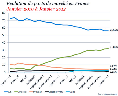 Voici un article du Monde de Septembre 2011 indiquant qu’Android avait dépassé iOS.