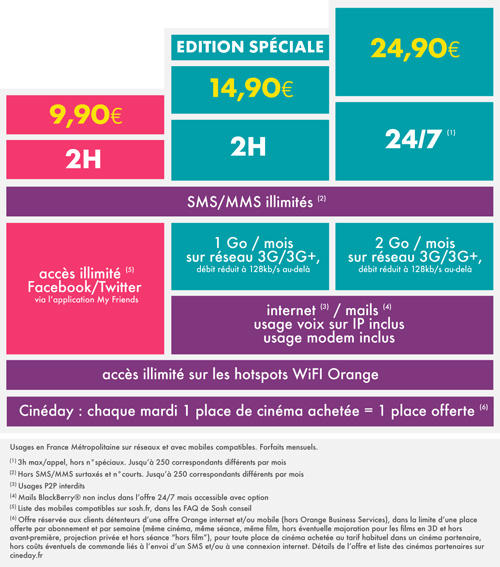 Le petit dernier de Sosh, le « forfait 2h » permet, au travers d’une nouvelle application : My Friends, d’accéder au réseau Facebook et Twitter via le réseau de l’opérateur historique. L’accès aux hotspots Wi-Fi Orange est aussi compris dans l’offre.