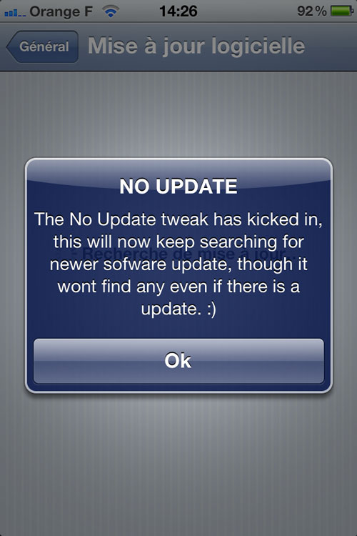 No Update est un nouveau tweak qui vient de voir le jour sur Cydia, celui-ci permet d’empêcher la recherche des mises à jours firmware sur votre appareil, évitant une mise à jour involontaire. Le tweak sera opérationnel directement après installation, aucuns réglages nécessaires.