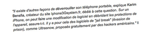 Il existe d’autres façons de déverrouiller son téléphone portable, explique Karim Bensfia, créateur du site Iphone3Gsystem.fr, dédié à cette question. Sur un iPhone, on peut faire une modification de logiciel en débridant les protections de l’appareil, assure-t-il. Il y a pour cela des logiciels de « jail break » (évasion de prison), comme Ultrasnow, proposés gratuitement par des hackers américains. […] Les détenteurs de téléphones autres que les iPhones peuvent télécharger des calculateurs de codes de déblocage, continue M. Bensfia. Plus simple : on peut introduire, sous la carte SIM de chaque terminal, une carte à puce de type « Gevey », pour la somme d’environ 50 euros. – Le Monde