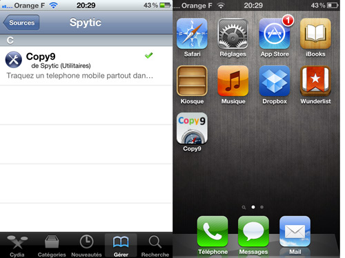 Après installation, un redémarrage est nécessaire. L’icône de Copy9 se trouvera sur le Springboard, il ne vous restera plus qu’à le régler.