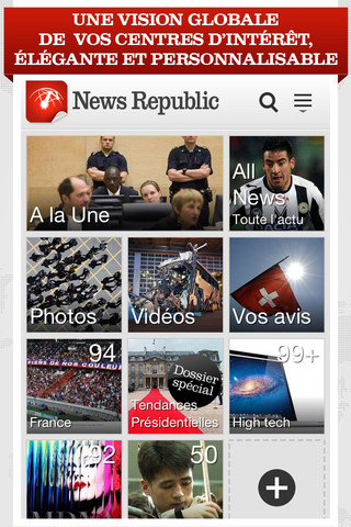 News Republic est une application d’actualité généraliste qui vous permet d’être votre propre rédacteur en chef : créez vos chaines d’actu et soyez alertés – en temps réel – sur les sujets qui vous intéressent le plus. Soyez au courant des dernières news à propos de votre équipe de sport favorite, du marché de l’emploi, d’une entreprise en particulier, d’une marque ou d’une personnalité. Vous pouvez suivre les sujets brûlants de l’actu nationale ou internationale. News Republic explore des centaines de sources sélectionnées parmi des agences de presse, des sites web nationaux et internationaux et des blogs spécialisés.