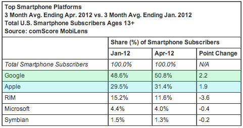 La société comScore a récemment publié un rapport concernant la téléphonie mobile aux USA qui comporte 117 millions d’utilisateurs. Sur une période de trois mois (fin janvier 2012 à fin avril 2012), même si Samsung est leader du marché avec 25,9 pour cent, iOS gagne de plus en plus de terrain contrairement à Android qui en perd.