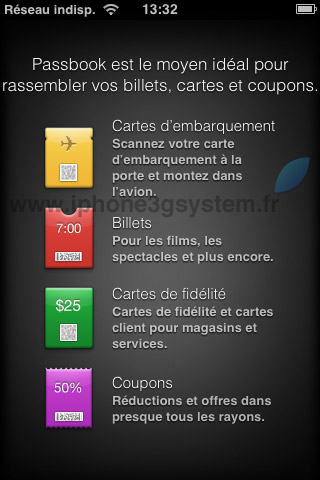 – La page d’accueil de l’application Passbook donne plus d’informations sur la classification des différents éléments