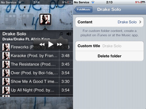 FoldMusic est un tweak disponible sur Cydia qui va, de façon très élégante, afficher vos différents playlist et albums directement sur votre écran d’accueil au travers d’un dossier dédié. Il vous sera donc possible de contrôler votre musique directement depuis l’écran d’accueil de votre appareil.