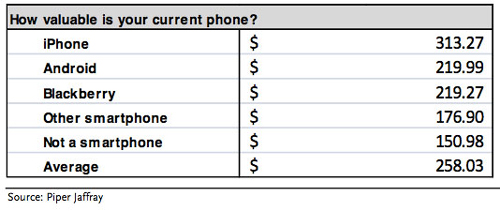 Une nouvelle enquête menée par Piper Jaffray a interrogé plus de 400 consommateurs aux États-Unis et en Asie afin de savoir la valeur qu’ils donnent à leur smartphone. L’iPhone arrive largement en tête avec une valeur de 313 $ contre Android avec 219 $ soit 94 $ de différence.