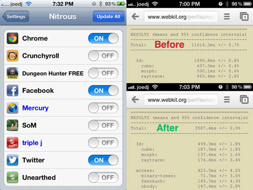 Nitrous est un nouveau tweak disponible sur Cydia qui va venir légèrement booster certaines de vos applications. En effet dans les dernières versions d’iOS Apple a implémente un nouveau moteur Javascript, « Nitro », qui permet une exécution de certains scripts beaucoup plus rapide.