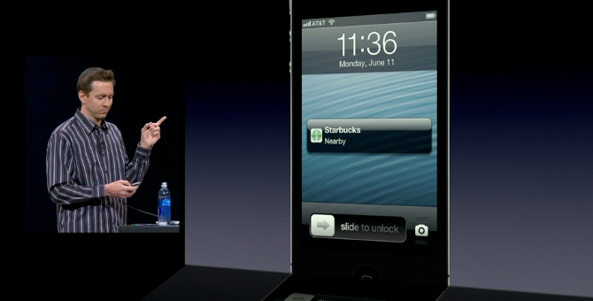 De plus, Passbook prend en charge la géolocalisation ainsi que l’espace-temps. Il est donc possible d’être alerté par notification push lorsqu’un coupon vient à expiration ou que vous pouvez utiliser un coupon à proximité de votre emplacement. Par exemple, votre carte d’embarquement est automatiquement ouverte lorsque vous entrez dans l’aéroport ou votre coupon de réduction s’affiche lorsque vous êtes sur le point de payer en caisse. Comme le montre Forstall avec Starbucks ci-dessous :