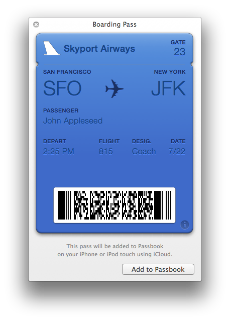 Air France valide ton billet, et t’envoie un fichier JSON par mail. Depuis ton Mac ou ton iPhone, tu l’ajoutes à Passbook. C’EST TOUT. :)