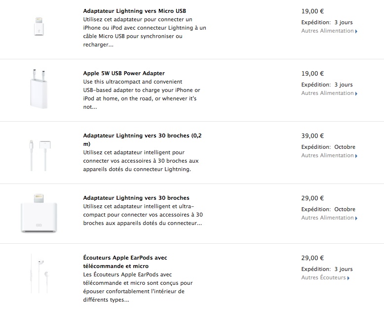 Avec la sortie de l’iPhone 5, Apple en a profité pour lancer son nouveau connecteur Dock, le « Lightning ». Avec celui-ci, de nombreuses questions ont vu le jour, notamment sur le prix, sur la compatibilité avec les anciens accessoires. On découvre aussi désormais les nouveaux écouteurs de la pomme, les « EarPods ». La liste des accessoires et les prix :