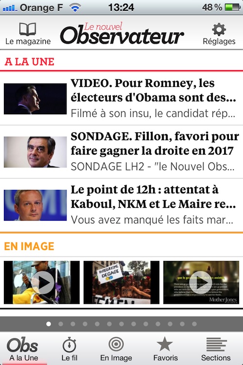 La partie En Image, elle, comme son nom l’indique, vous permet de retrouver l’actualité en photos et vidéos (pour ceux qui n’aiment pas la lecture, avouez que c’est pratique !). La section Favoris reprendra vos articles préférés pour les consulter et les retrouver très simplement et rapidement. L’onglet Sections, lui, vous permettra d’accéder directement à vos envies, comme le Sport, le High-Tech…
