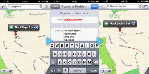 Vous l’avez peut-être remarqué, Apple a mis en place un moyen de rapporter les erreurs que l’on peut trouver sur la carte. Le blog Coolsmartphone s’est amusé à tester l’efficacité de Cupertino pour mettre ses cartes à jour. Il aura suffi pas moins de 24 h pour que la demande soit prise en compte et le changement effectué.
