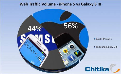 Seulement 3 semaines après le début de sa commercialisation l’iPhone 5 se place déjà en haut du podium en terme de surf sur le web. Selon la régie publicitaire Chitika le nouvel appareil d’Apple représenterait 56% du trafic sur son réseau, contre 44% pour le Samsung Galaxy S3.