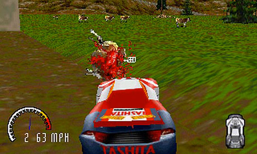 « Carmageddon, c’est la liberté pure au volant, un jeu dans lequel randonneurs (et vaches !) rapportent des points. Les adversaires ? Une bande de joyeux furieux dotés d’engins motorisés de la mort. Venez découvrir un gameplay tu-conduis-où-tu-veux et une violence potache irréelle. Un jeu de course où la course est réservée aux chochottes. »