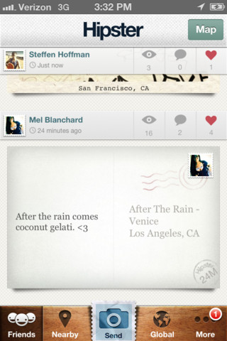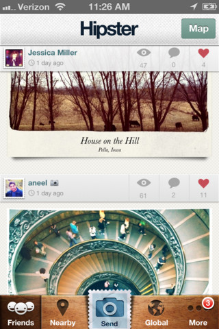 Pour les utilisateurs connaissant les différents réseaux sociaux de la photographie comme Instagram, PicYou ou encore Cinemagram, Hipster ne devrait pas trop vous surprendre au niveau de l’utilisation et des différents onglets. On part sur le même principe que ces derniers en sélectionnant ou en prenant une photo que l’on va tout simplement retoucher avec des filtres. Seulement, la différence, c’est que vos photographies vont se transformer en superbes cartes postales !
