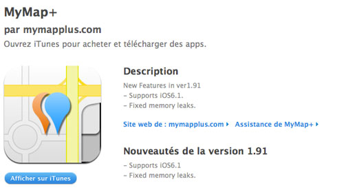 Comme le signalent nos confrères de Mac4ever, la première application compatible avec l’iOS 6.1 est de sortie. Il s’agit de MyMap+, application mise à jour aujourd’hui pour accueillir donc le futur iOS d’Apple. Pour rappel, la seconde bêta a vu le jour le 12 Novembre, la version finale, elle, n’a toujours pas de date.