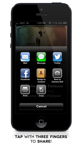 Un « tap » avec trois doigts permet le partage de votre écoute avec vos amis via Mail, SMS ou encore Facebook et Twitter !