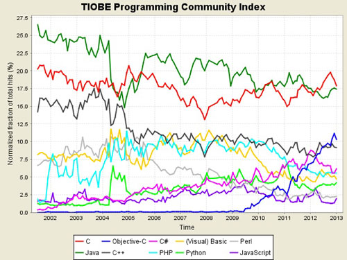 En gros l’objective-C est le langage de programmation utilisé pour nos applications iOS et OSX, cette étude montre simplement que plus de recherches sur ce langage on été faites depuis 2009 jusqu’à passer 3ème, forcément, tout le monde est « obligé » de s’y mettre pour avoir une visibilité sur des plate formes de plus en plus prisées. En d’autres termes, il est primordial pour une société d’avoir sa propre application iOS (et androïd). À noter que les apps Android sont codées en java.