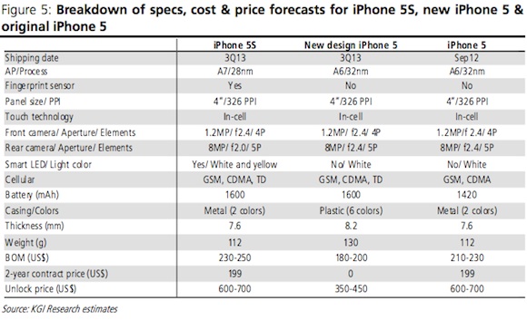 iPhone : Kuo s’attend à ce que Apple présente à la fois un iPhone 5S et iPhone 5 « revu » autour de Juin ou Juillet de cette année, l’iPhone 5S apparait très similaire à l’iPhone 5 actuel, mais portant un certain nombre d’améliorations, y compris une puce A7 pour une meilleure performance, un capteur d’empreintes digitales, et des améliorations caméra comme une ouverture f2.0 et un flash LED intelligent. Il croit aussi que l’iPhone à moindre coût sera à bien des égards un simple iPhone 5 reconditionné et un peu plus épais (8,2 mm contre 7,6 mm actuellement) avec un boîtier en plastique disponible en six couleurs.