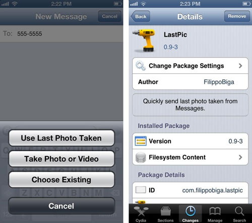 Filippo Bigarella a publié un nouveau tweak sur Cydia vraiment intéressant et surtout très pratique. Nommé LastPic le tweak va vous permettre de rapidement envoyer la dernière photo prise avec votre téléphone.