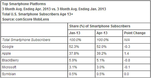 Avec une progression de 1.4 point au premier trimestre 2013, Apple continue de dominer le marché US et s’octroie 39,2 % du marché. Samsung continue lui aussi sa progression et prend 22 % du marché.