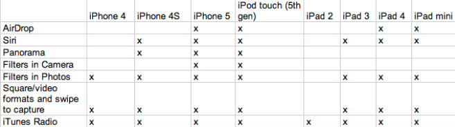 Vous remarquerez que les seuls appareils compatible avec tout les nouvelles fonctions sont seulement l’i5 et l’iPod touch 5 comme par le plus grand des hasard les deux derniers produits sortit par Apple.Et n’allez pas dire que c’est normale car le Touch4 et l’i4 et 4s ne supporte pas ils ont cassiment la même puce !!!!
