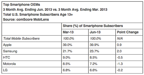 Samsung se place en seconde position avec 23,7 %, soit une progression de 2 points. Tandis que HTC, Motorola et LG perdent des parts de marché laissant ainsi les deux géants du smartphone se partagent plus de 60 % du marché US.