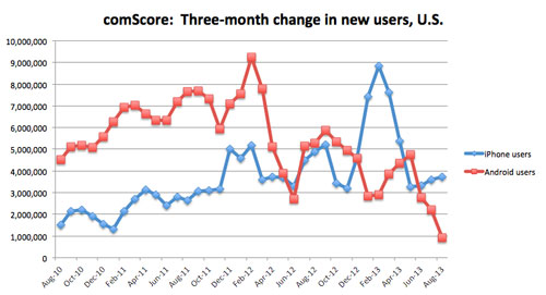 Apple est en bonne voie pour dominer le marché des smarphones aux États-Unis avec une croissance constante depuis les trois derniers trimestres. De plus, l’étude a été faite avant la sortie de l’iPhone 5S et l’iPhone 5C qui devraient encore accroitre la progression au prochain trimestre.
