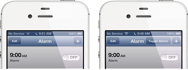Après installation, ce tweak va simplement ajouter un bouton dans l’application Horloge afin d’ activer/désactiver toutes vos alarmes d’un seul clic.