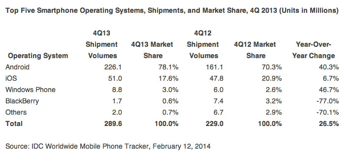 iOS affiche sa plus faible croissance de 2013 avec 6,7% (12,9% sur l’année). Apple a été largement critiqué pour ne pas avoir sorti un smartphone à bas coût et un iPhone avec un écran plus grand. IDC pense que 2014 sera l’occasion pour la firme de Cupertino de dévoiler un iPhone avec un plus grand écran, sans abandonner la version 4 pouces.