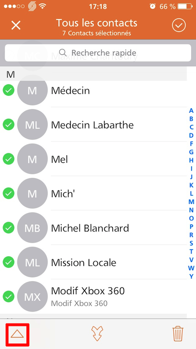 Si jamais vous souhaitez envoyer une liste choisie de contacts, sélectionnez vos contacts, puis cliquez sur la flèche en bas à gauche de votre liste de contacts, celle-ci :